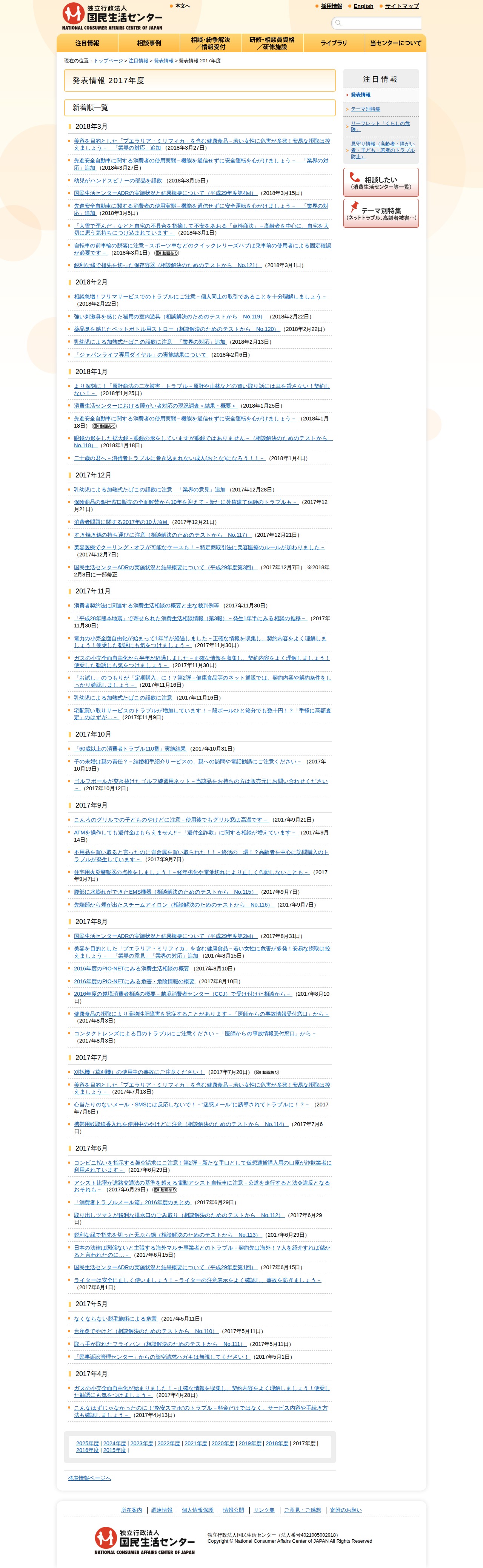 このページは、国民生活センターの2017年度発表情報をまとめたものです。2018年3月から2017年10月までの消費者トラブルに関する注意喚起や調査結果が時系列で掲載されています。プエラリア・ミリフィカ含有食品による健害、ハンドスピナーの誤飲、加熱式たばこの誤飲、点検商法、フリマサービストラブル、原野商法被害など、様々な消費者問題が報告されています。また、電力・ガス自由化やクーリング・オフ制度、定期購入トラブルなど、制度変更に関連した相談事例も掲載されています。