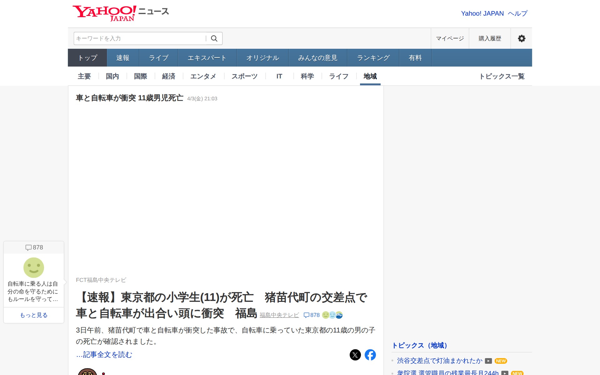 車と自転車が衝突 11歳男児死亡 - Yahoo!ニュース