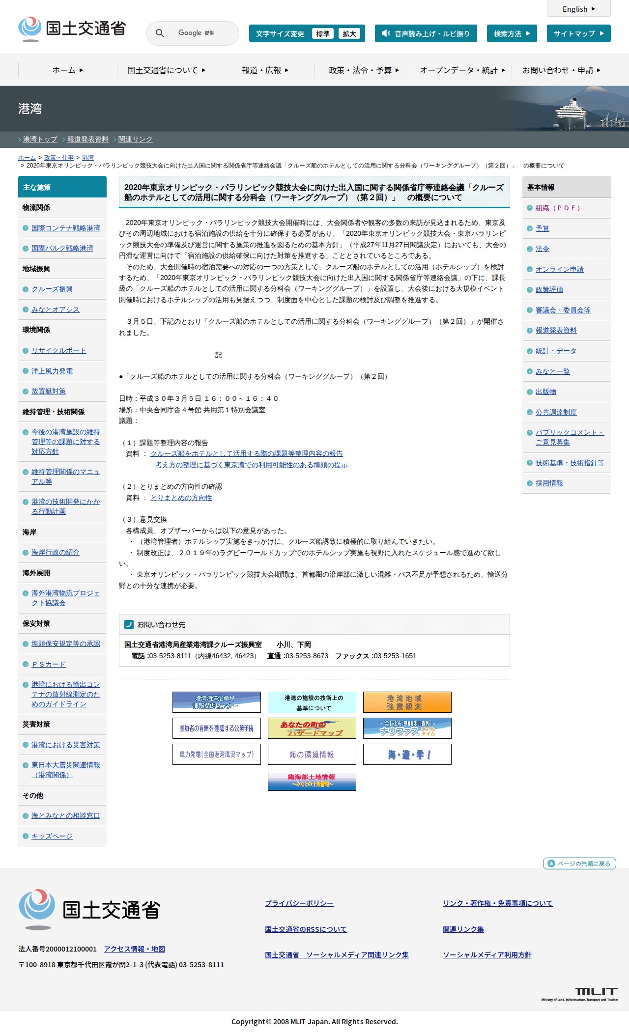 港湾:2020年東京オリンピック・パラリンピック競技大会に向けた出入国に関する関係省庁等連絡会議「クルーズ船のホテルとしての活用に関する分科会(ワーキンググループ)(第2回)」 の概要について - 国土交通省 - 保存されたスクリーンショット