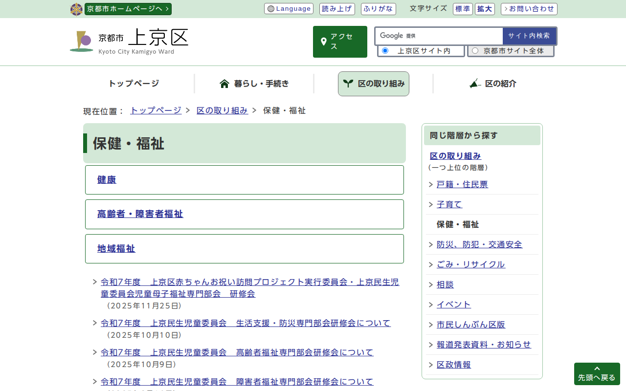 京都市上京区役所:保健・福祉 - 保存されたスクリーンショット