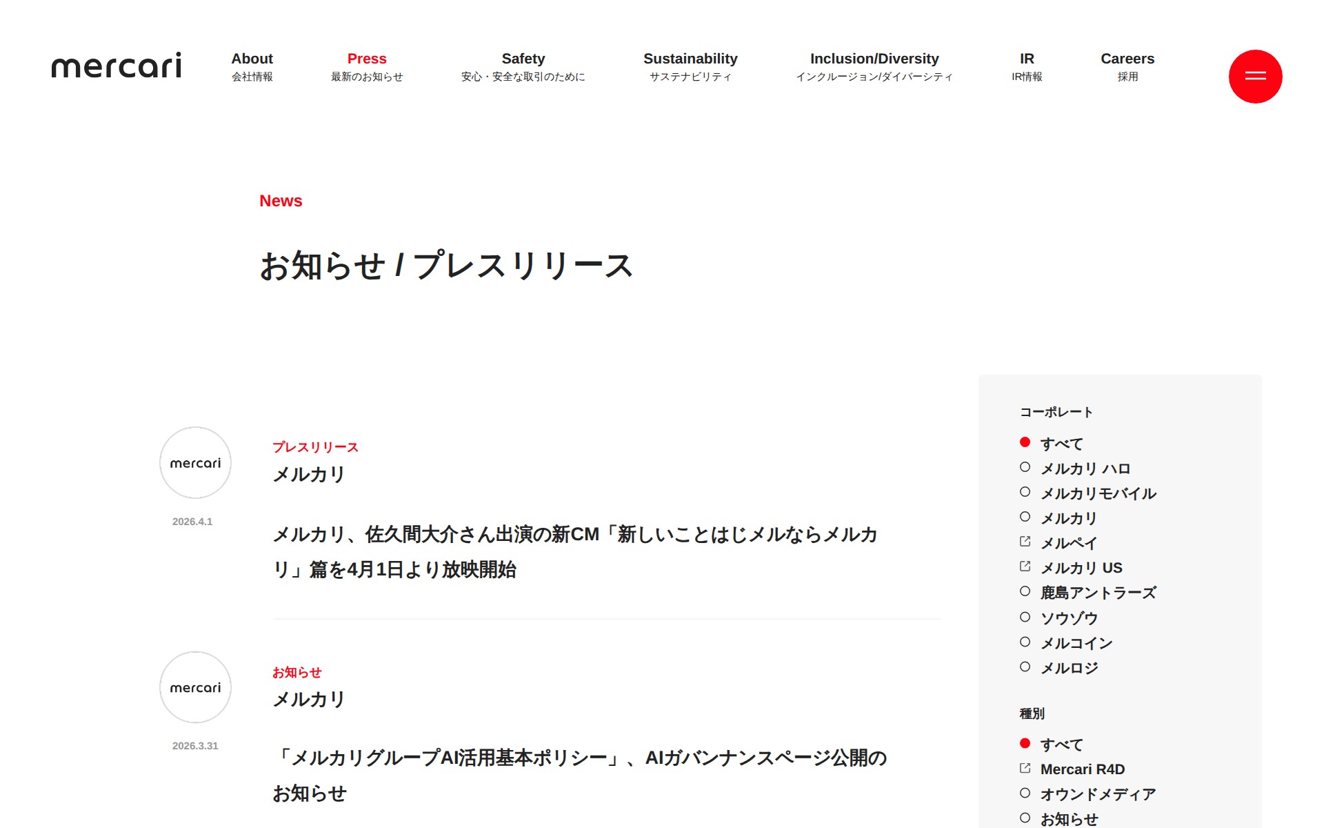 このページは、株式会社メルカリの最新のお知らせとプレスリリースを掲載しています。2026年3月~4月の情報として、新CM放映開始、AI活用基本ポリシーの公開、スマートフォン代に関する調査結果、鹿島アントラーズスポンサー試合開催、生成AIを活用した検索機能提供開始など、複数のニュースが紹介されています。また、メルカリShopsでの地域施設備品販売やトレンド通信による商品検索ランキング情報も掲載されており、メルカリグループの多角的な事業展開と社会貢献活動が報告されています。