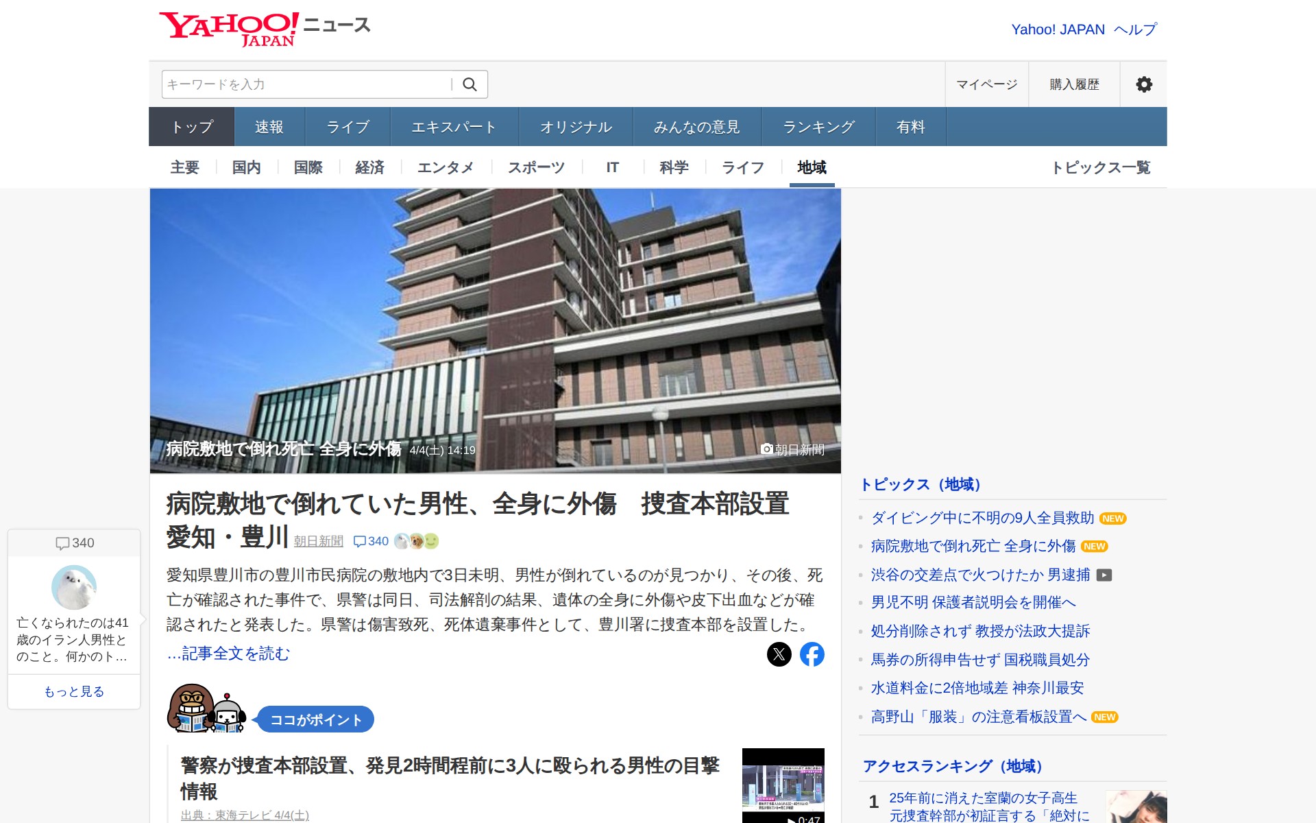病院敷地で倒れ死亡 全身に外傷 - Yahoo!ニュース - 保存されたスクリーンショット