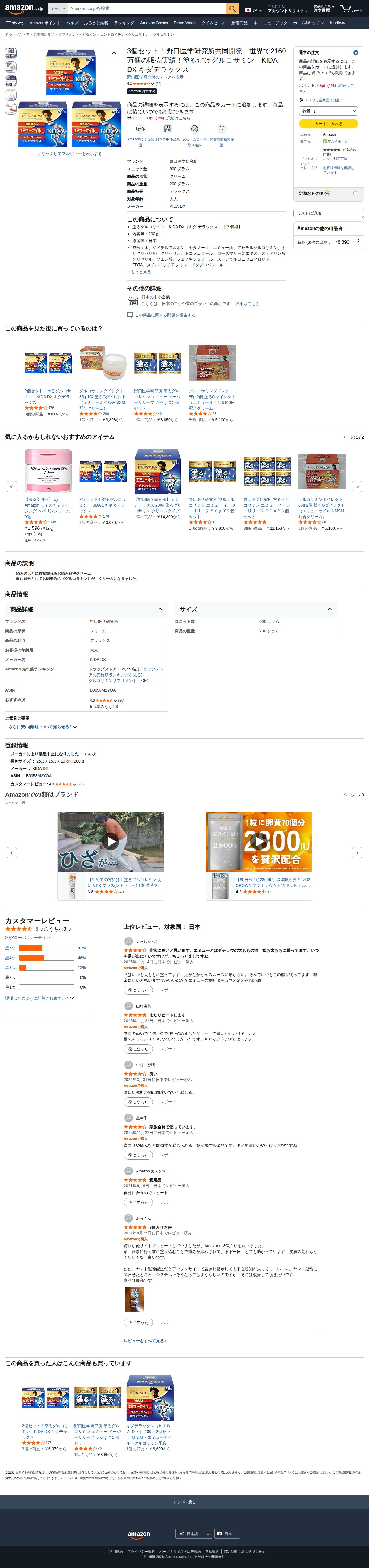 このページは、野口医学研究所が共同開発した塗るグルコサミン製品「KIDA DX キダデラックス」の3個セットをAmazonで販売しているページです。世界で2160万個の販売実績を持つこの製品は、クリーム状で塗るだけで使用できます。内容量は200g×3で、水やジメチルスルホン、エミュー油、アセチルグルコサミンなどを主成分としています。価格は8,890円で、Amazonによる発送で、マルイモールが販売元です。顧客評価は4.3つ星で、日本の中小企業ブランド商品として位置づけられています。