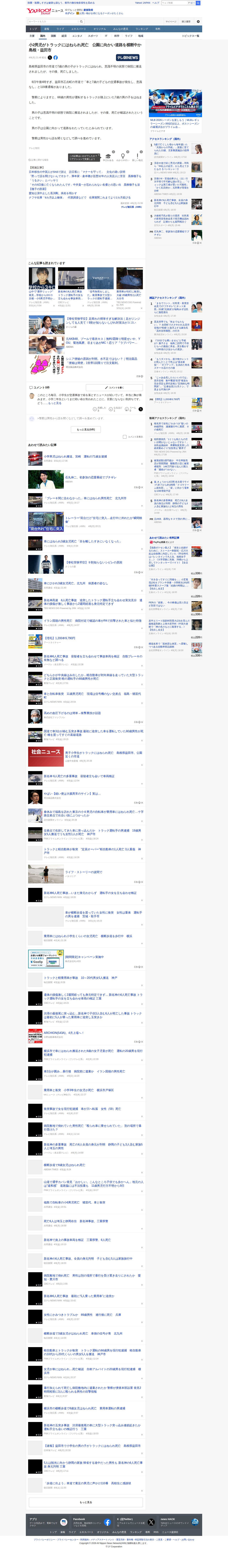 このページは、島根県益田市で発生した交通事故のニュースを報じている。4月6日午後4時すぎ、市道で68歳の男性が運転するトラックが、公園に向かって道路を横断していた7歳の男児をはねた。男児は意識不明のまま病院に搬送されたが、その後死亡が確認された。警察は運転者から事情聴取を行い調べを進めている。