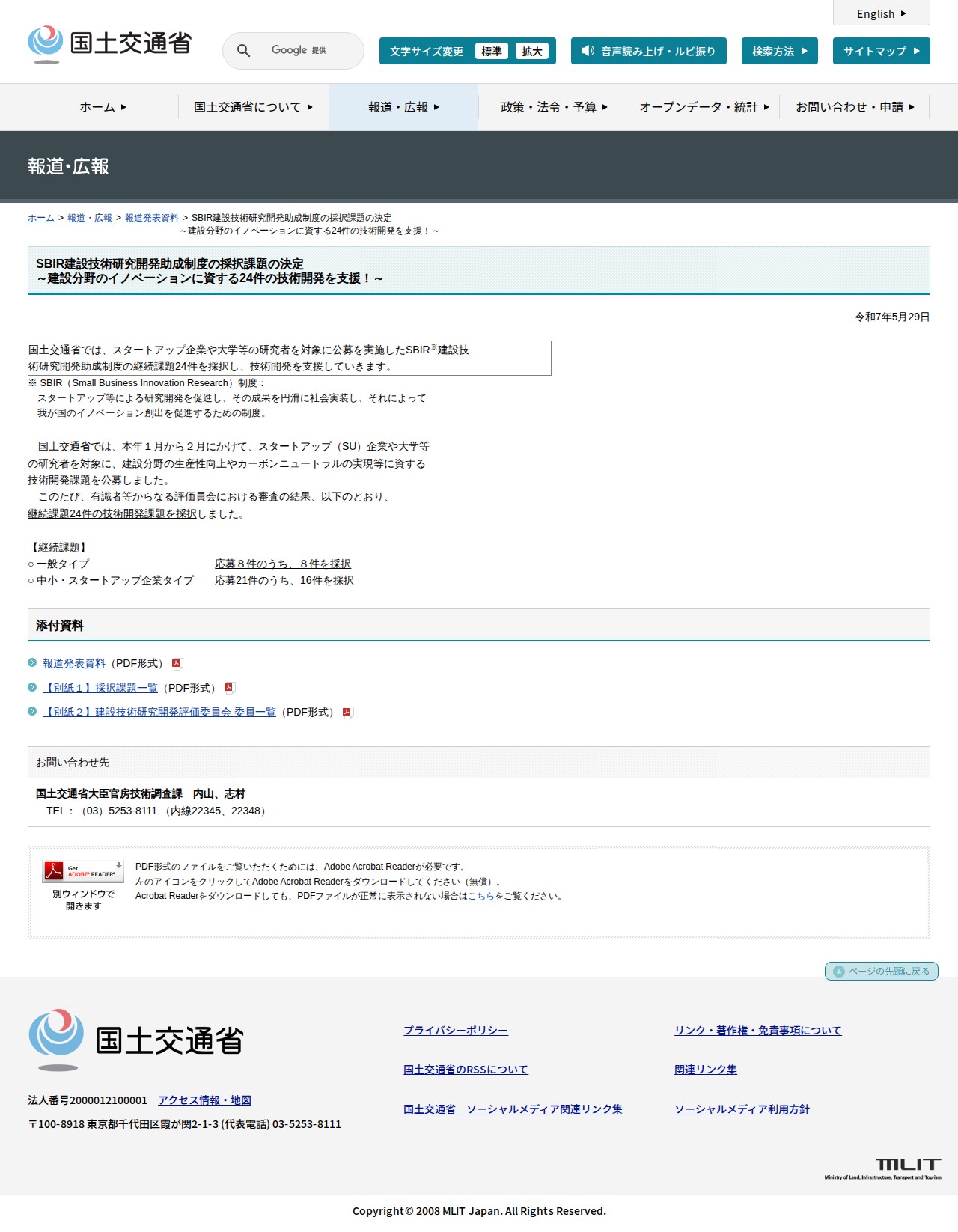 報道発表資料:SBIR建設技術研究開発助成制度の採択課題の決定<br>~建設分野のイノベーションに資する24件の技術開発を支援!~ - 国土交通省