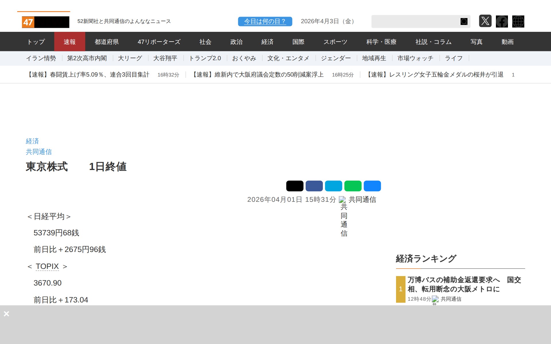 このページは、2026年4月1日の東京株式市場の終値を報告するニュース記事です。日経平均株価は53739円68銭で、前日比2675円96銭の上昇となりました。TOPIX(東証株価指数)は3670.90で、前日比173.04の上昇です。記事では、中東混乱の収束期待が買い戻しにつながったことが背景として述べられています。また、関連する株価ニュースや求人情報も掲載されています。