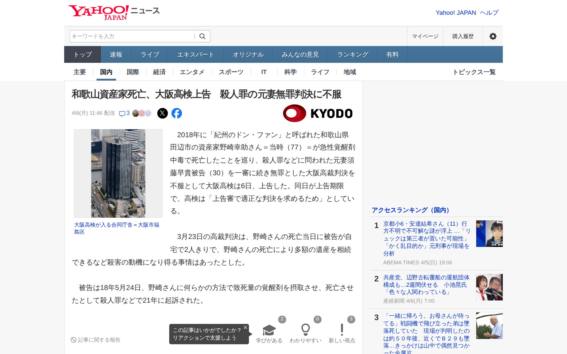 和歌山資産家死亡、大阪高検上告 殺人罪の元妻無罪判決に不服(共同通信) - Yahoo!ニュース