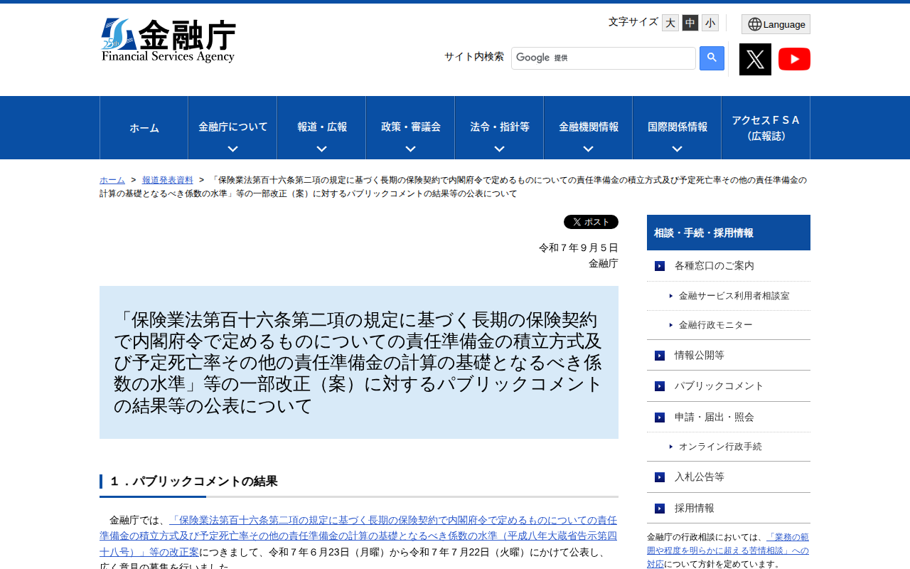 「保険業法第百十六条第二項の規定に基づく長期の保険契約で内閣府令で定めるものについての責任準備金の積立方式及び予定死亡率その他の責任準備金の計算の基礎となるべき係数の水準」等の一部改正(案)に対するパブリックコメントの結果等の公表について:金融庁