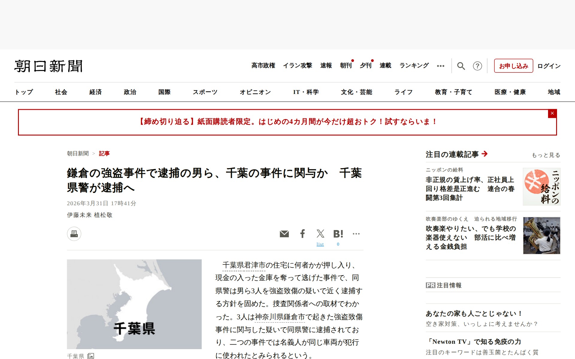 鎌倉の強盗事件で逮捕の男ら、千葉の事件に関与か 千葉県警が逮捕へ [千葉県]:朝日新聞 - 保存されたスクリーンショット
