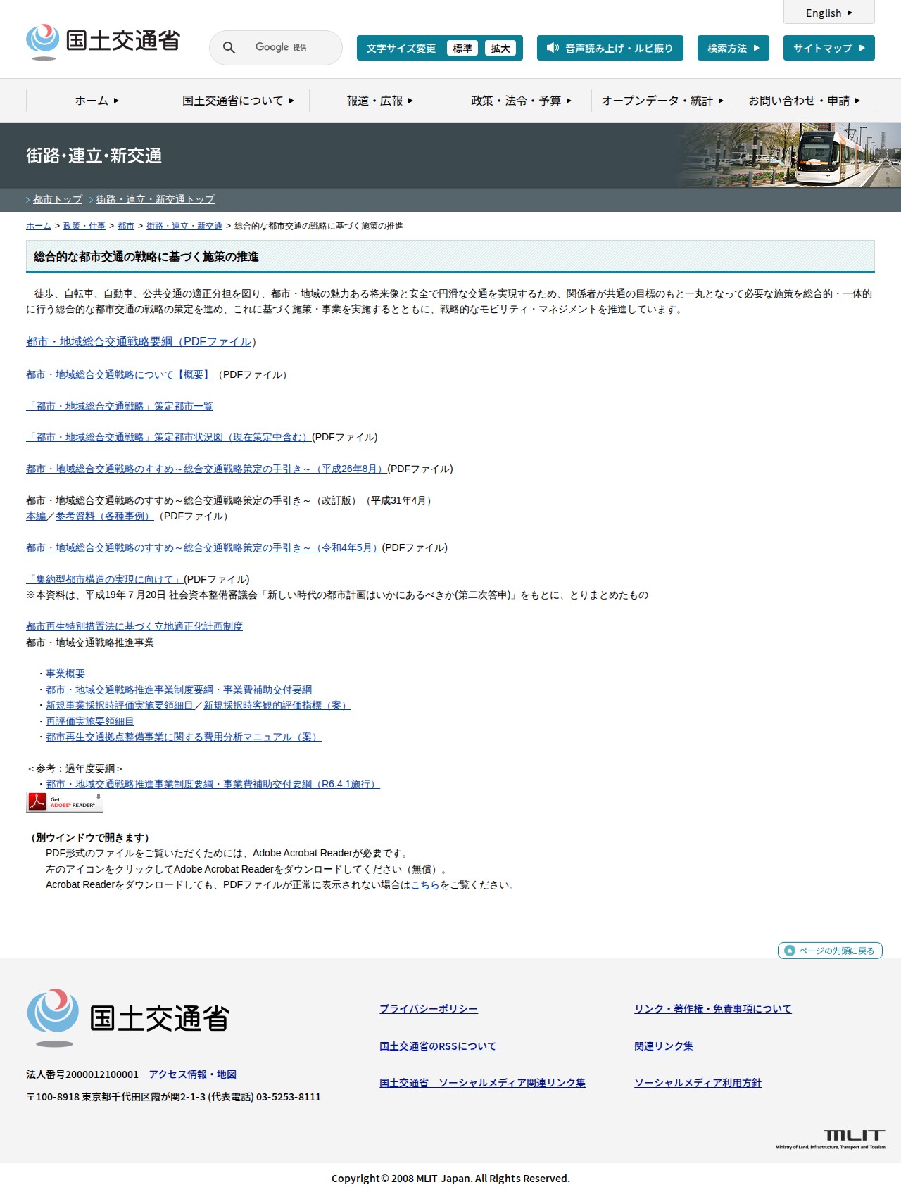 このページは、国土交通省による都市交通戦略に関する施策を紹介しています。徒歩、自転車、自動車、公共交通の適正な分担を図り、安全で円滑な交通と魅力ある都市・地域の実現を目指して、総合的な都市交通戦略の策定と実施を推進しています。関係者が共通目標のもと一体となり、戦略的なモビリティ・マネジメントを進めています。ページでは、戦略要綱、策定手引き、立地適正化計画制度、交通戦略推進事業などの関連資料やPDFファイルへのリンクが提供されています。
