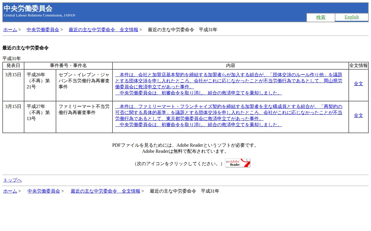 このページは、厚生労働省中央労働委員会の平成31年における主な命令をまとめたものです。セブン-イレブン・ジャパンとファミリーマートの不当労働行為再審査事件について記載されています。両事件とも、フランチャイズ加盟者の組合が団体交渉を申し入れたものの、会社が応じなかったケースで、中央労働委員会は初審命令を取り消し、組合の救済申立てを棄却しました。