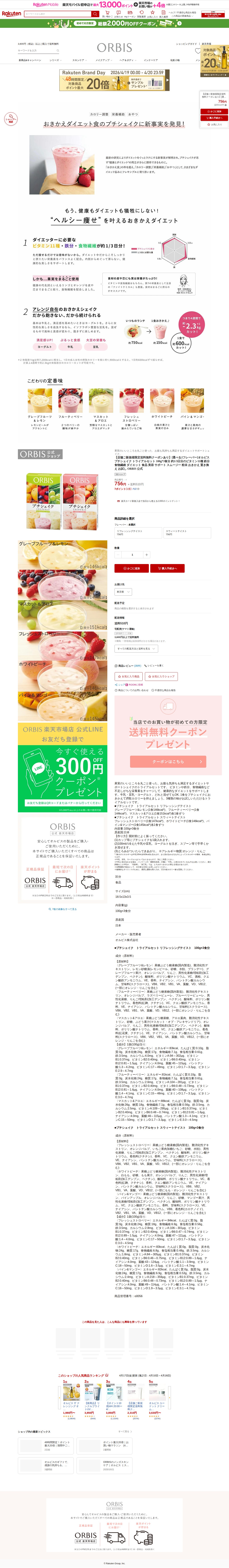 【楽天市場】【店舗ご新規様限定送料無料クーポンあり】[選べる2フレーバー]オルビス プチシェイク トライアルセット 100g*3食分 約1/3日分のビタミン11種 鉄分 食物繊維 ダイエット 食品 美容 サポート スムージー 粉末 おきかえ 置き換え お試し ORBIS 公式:オルビス公式 楽天市場店 - 保存されたスクリーンショット