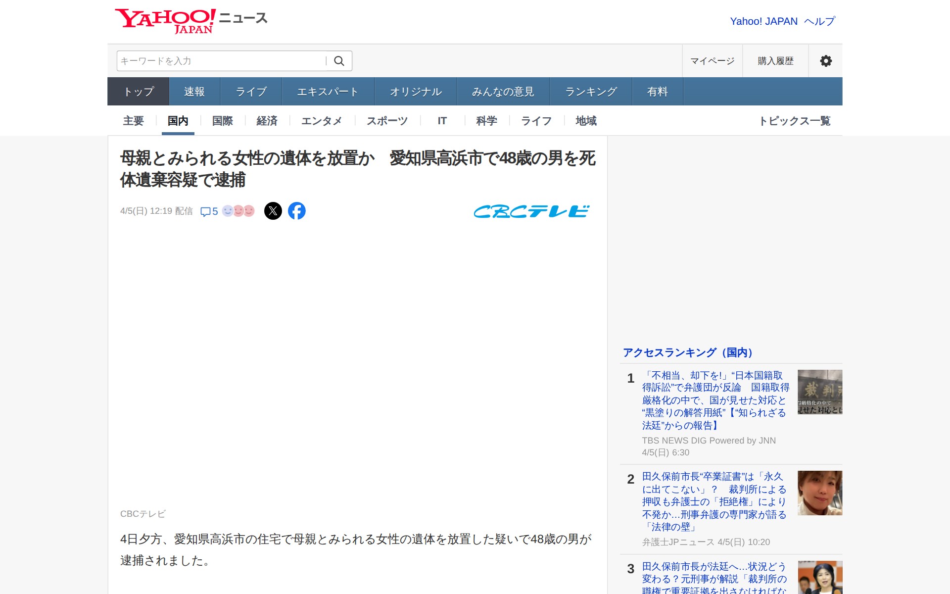 母親とみられる女性の遺体を放置か 愛知県高浜市で48歳の男を死体遺棄容疑で逮捕(CBCテレビ) - Yahoo!ニュース - 保存されたスクリーンショット