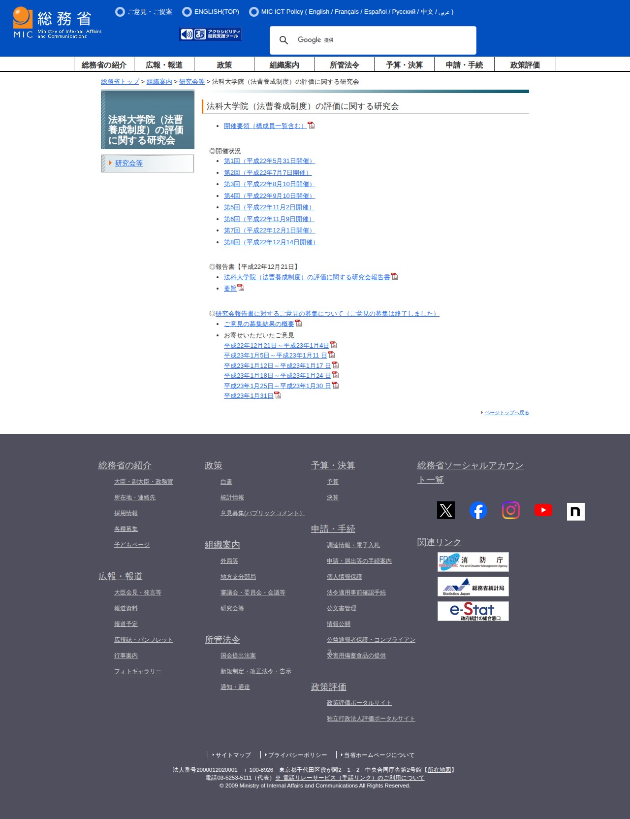 このページは、総務省が設置した法科大学院(法曹養成制度)の評価に関する研究会の情報を掲載しています。平成22年5月31日から12月14日にかけて全8回の研究会が開催され、12月21日に報告書が公表されました。ページには開催要領、各回の開催状況、報告書の要旨、および報告書に対して寄せられた意見の募集結果や具体的な意見が掲載されています。意見募集は平成23年1月31日に終了しました。