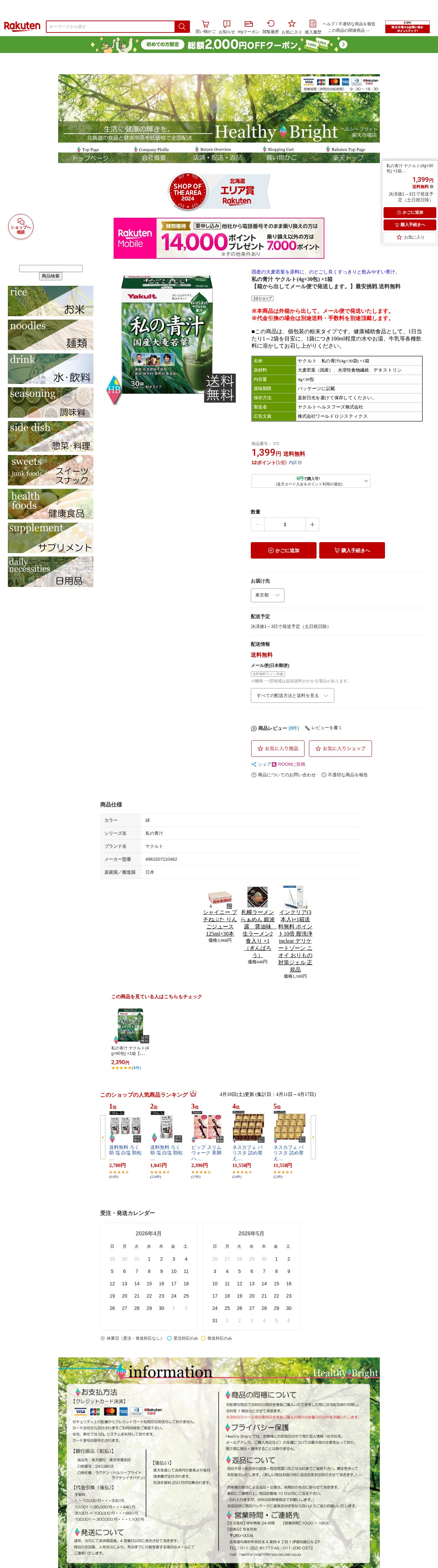 このページは、楽天市場で販売されているヤクルトの「私の青汁」の商品ページです。国産大麦若葉を使用した個包装粉末タイプの青汁で、4g×30包入り、価格は1,399円(送料無料)です。1日1~2袋を目安に水やお湯、牛乳などに溶かして飲用します。メール便で発送され、決済後1~3日での発送予定となっています。原材料は大麦若葉、水溶性食物繊維、デキストリンで、製造者はヤクルトヘルスフーズ株式会社です。