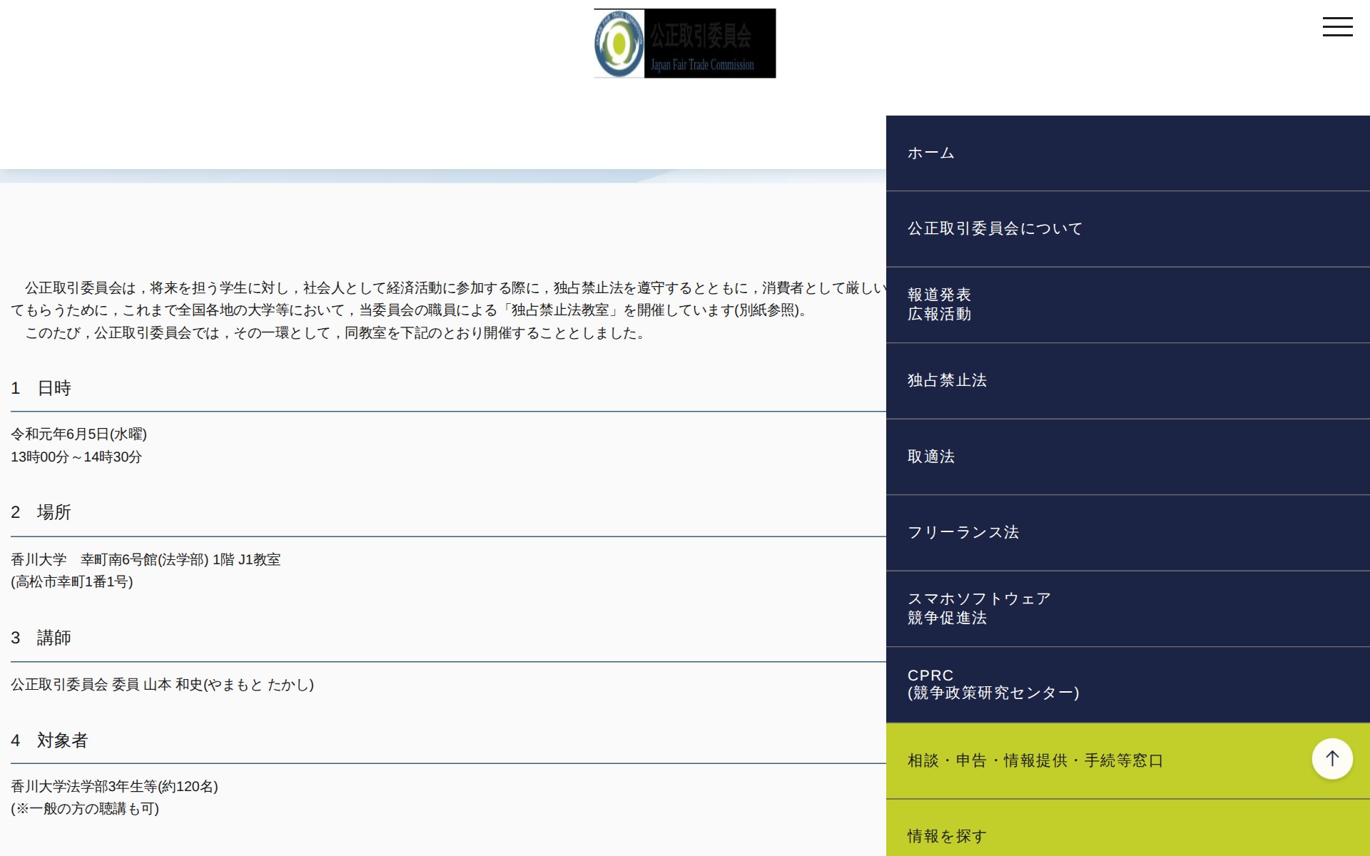 (令和元年5月29日)香川大学における「独占禁止法教室」の開催について | 公正取引委員会