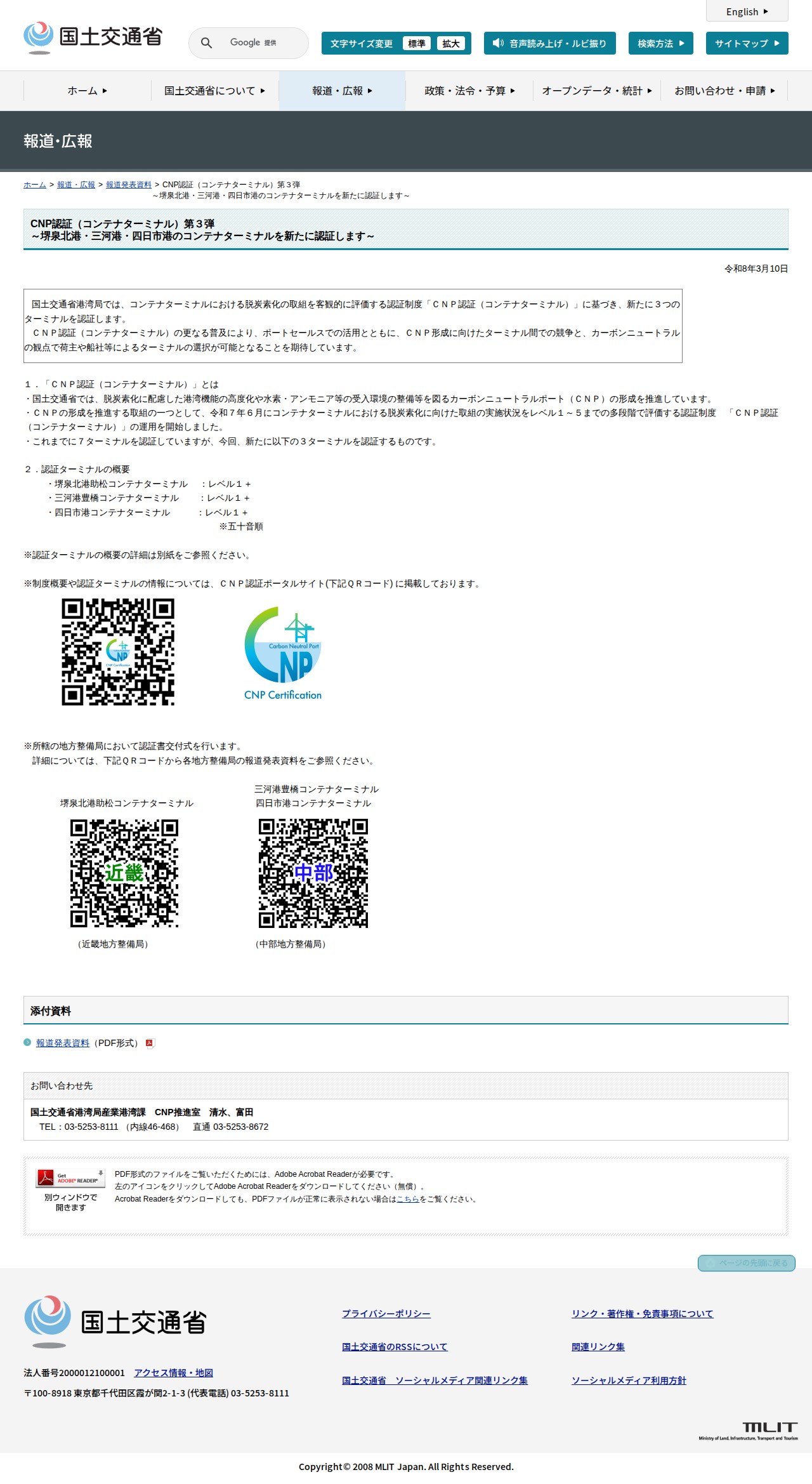 報道発表資料:CNP認証(コンテナターミナル)第3弾<br>~堺泉北港・三河港・四日市港のコンテナターミナルを新たに認証します~ - 国土交通省