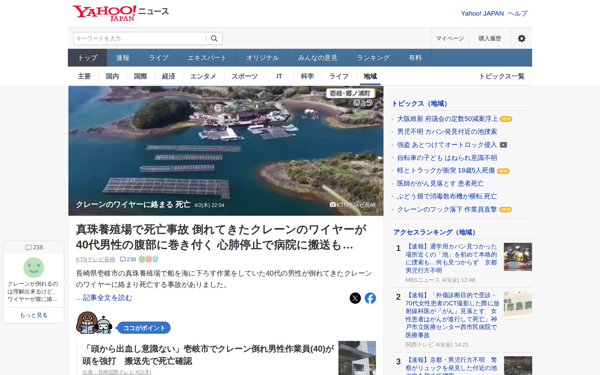 このページは、長崎県壱岐市の真珠養殖場で発生した労働災害事故を報じています。40代の男性作業員が船を海に下ろす作業中に、倒れてきたクレーンのワイヤーに腹部が絡まり、心肺停止の状態で病院に搬送されましたが死亡しました。事故原因の詳細は明らかにされていませんが、コメント欄ではクレーンの構造や過負荷による破損の可能性について議論されています。