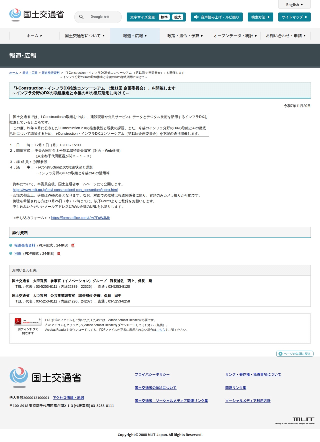 報道発表資料:「i-Construction・インフラDX推進コンソーシアム (第11回 企画委員会)」を開催します<br>~インフラ分野のDXの取組推進と今後のAIの徹底活用に向けて~ - 国土交通省