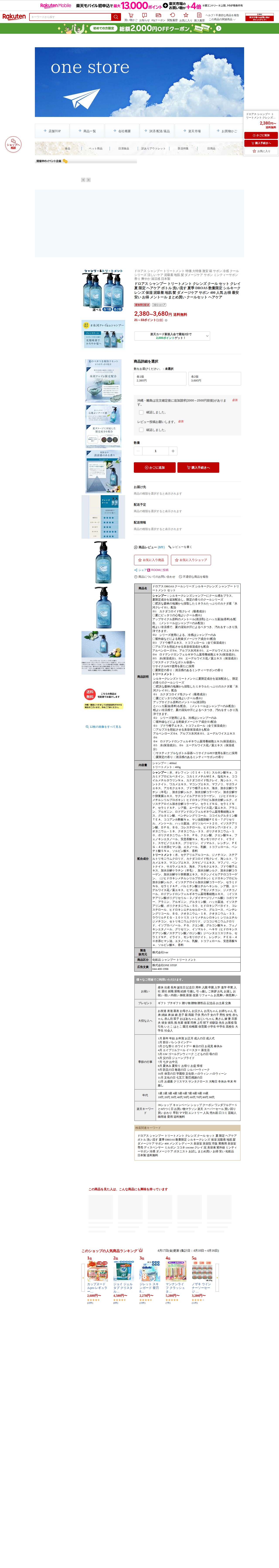 このページは、楽天市場で販売されているドロアス(DROAS)の夏季限定クールシリーズヘアケアセット商品です。シャンプー400mlとトリートメント400gのセット商品で、価格は各1個2,380円から各2個3,680円です。カナダ産の氷河クレイを配合し、泥吸着で地肌と髪をケアします。メントールとハッカ葉油でクール感を実現し、夏の湿気や汗によるベタつきをすっきり洗浄。ぶどう種子エキスなどの保湿成分で紫外線ダメージをケアし、ミンティーサボンの爽やかな香りが特徴です。リサイクルPET使用の環境配慮ボトルで、送料無料です。