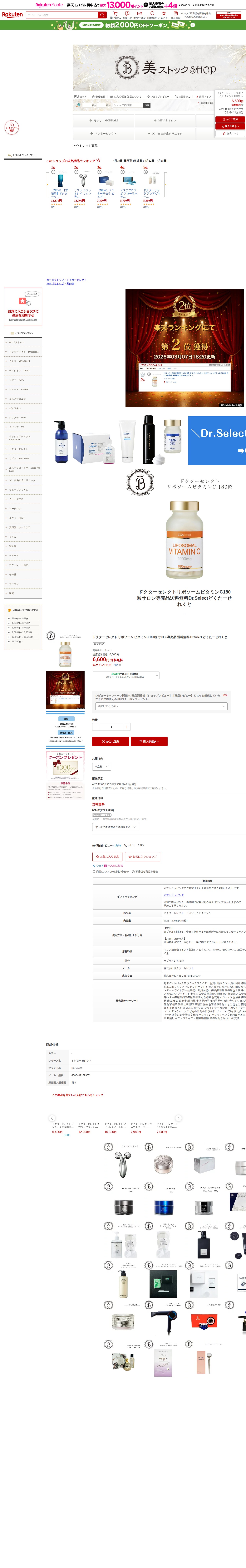 このページは、楽天市場で販売されているドクターセレクト リポソーム ビタミンC 180粒の商品ページです。6,600円で送料無料、4月20日12時までの注文で最短翌日配送対応しています。サロン専売品で、内容量は66.6g(370mg×180粒)。カプセルを開けて化粧水に混ぜて塗布するか、1日6粒を目安に経口摂取できます。ウコン抽出物とビタミンCを主成分とするサプリメントで、レビューキャンペーン実施中です。