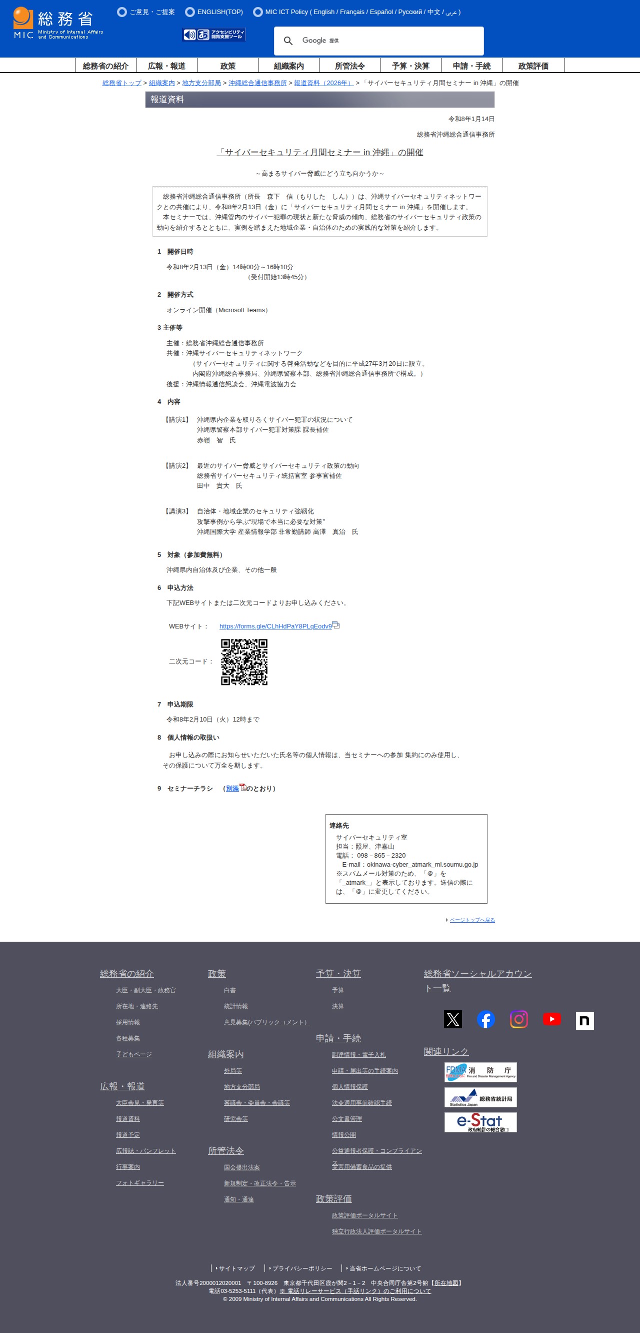 このページは、総務省沖縄総合通信事務所が沖縄サイバーセキュリティネットワークとの共催で開催する「サイバーセキュリティ月間セミナー in 沖縄」の案内です。令和8年2月13日にオンライン形式で開催されます。沖縄県内のサイバー犯罪の現状、最新の脅威傾向、総務省のサイバーセキュリティ政策、地域企業・自治体向けの実践的対策が紹介されます。参加は無料で、沖縄県内の自治体・企業・一般向けです。申込期限は2月10日正午です。