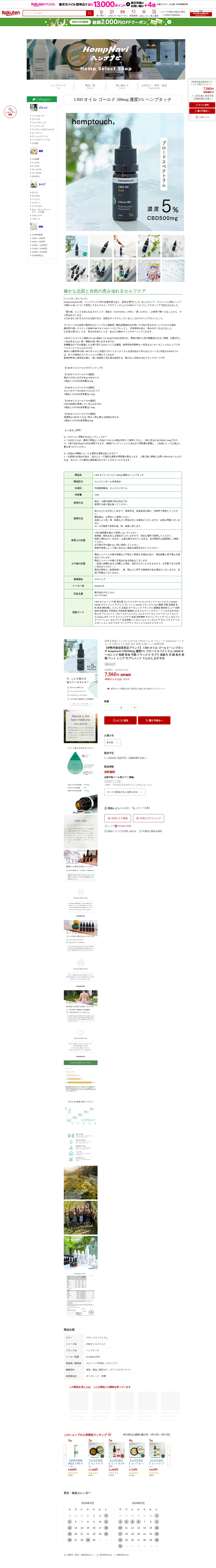 このページは、楽天市場で販売されているHemp Navi Shopの「CBD オイル ゴールド ヘンプタッチ」の商品ページです。スロベニア発祥のヘンプタッチブランドの5%濃度CBDオイル(500mg、7,560円)を紹介しており、1滴あたり1.6mgのCBDを含有しています。オーガニック栽培されたヘンプから超臨界二酸化炭素抽出法で抽出したCBDを、吸収率の高いMCTオイルにブレンドした製品で、不眠やリラックス、ペット用としても推奨されています。推奨摂取量は1日5~10滴、使用方法や濃度選びについてのFAQも記載されています。