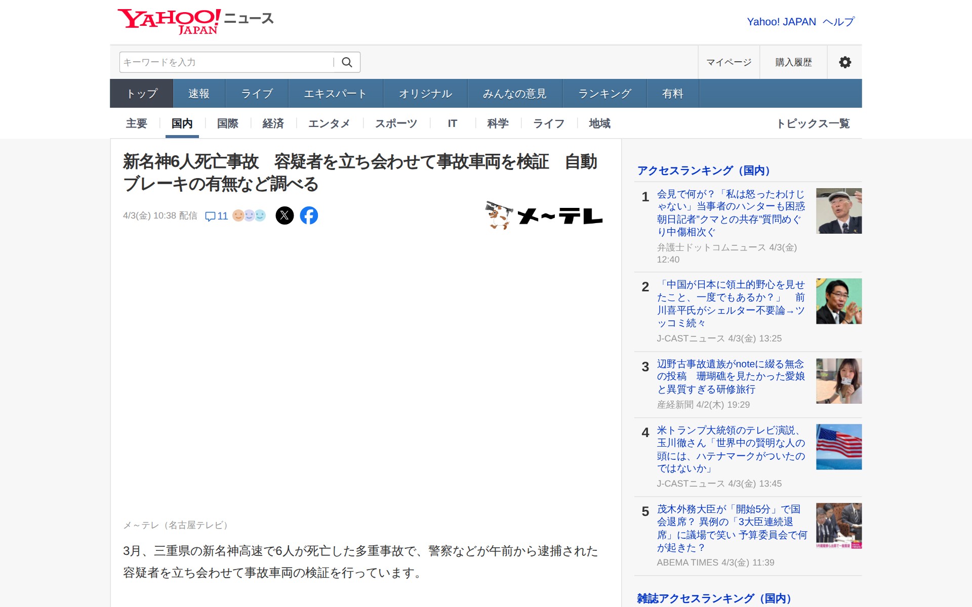 新名神6人死亡事故 容疑者を立ち会わせて事故車両を検証 自動ブレーキの有無など調べる(メ〜テレ(名古屋テレビ)) - Yahoo!ニュース - 保存されたスクリーンショット
