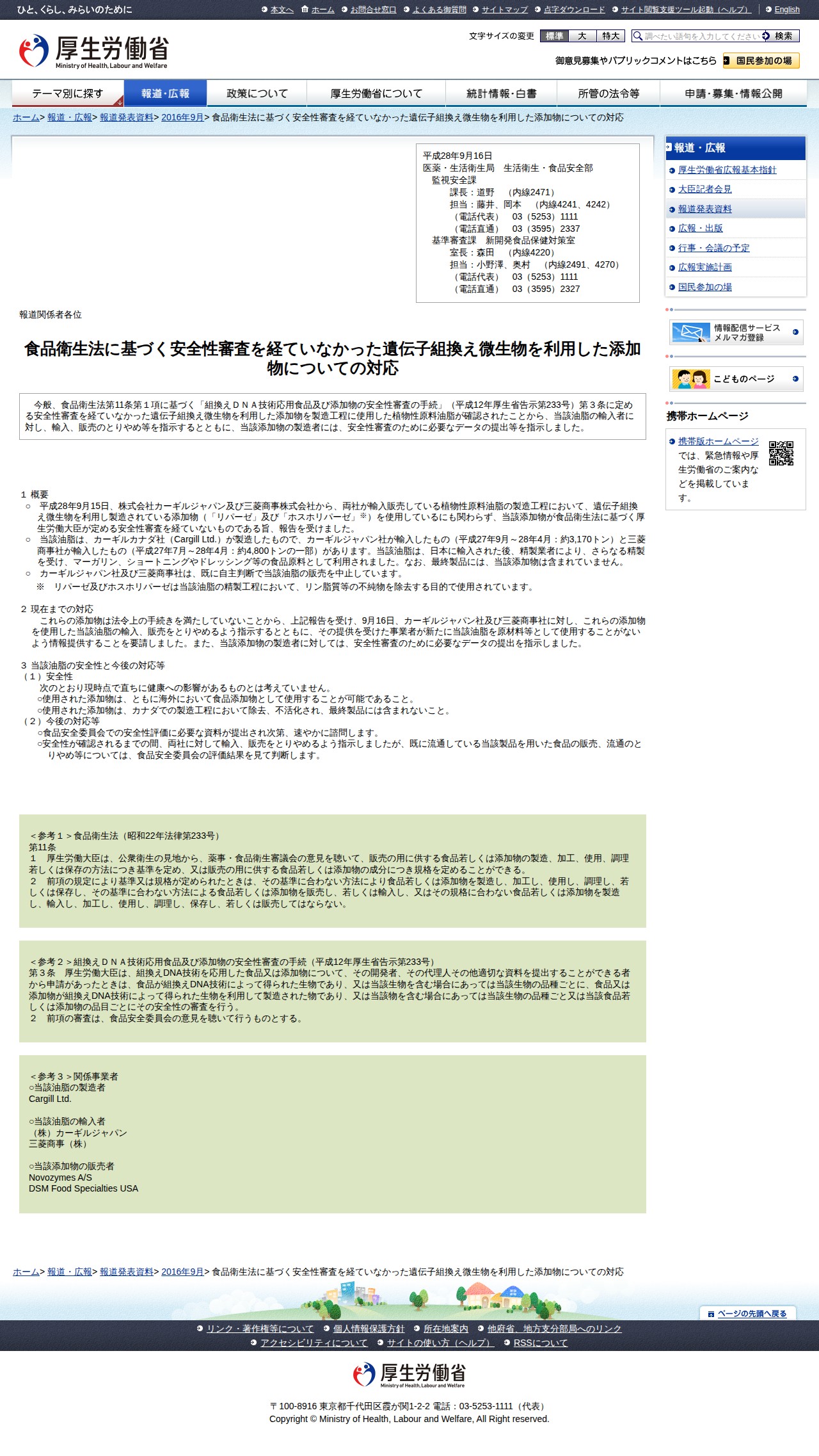 食品衛生法に基づく安全性審査を経ていなかった遺伝子組換え微生物を利用した添加物についての対応 |報道発表資料|厚生労働省