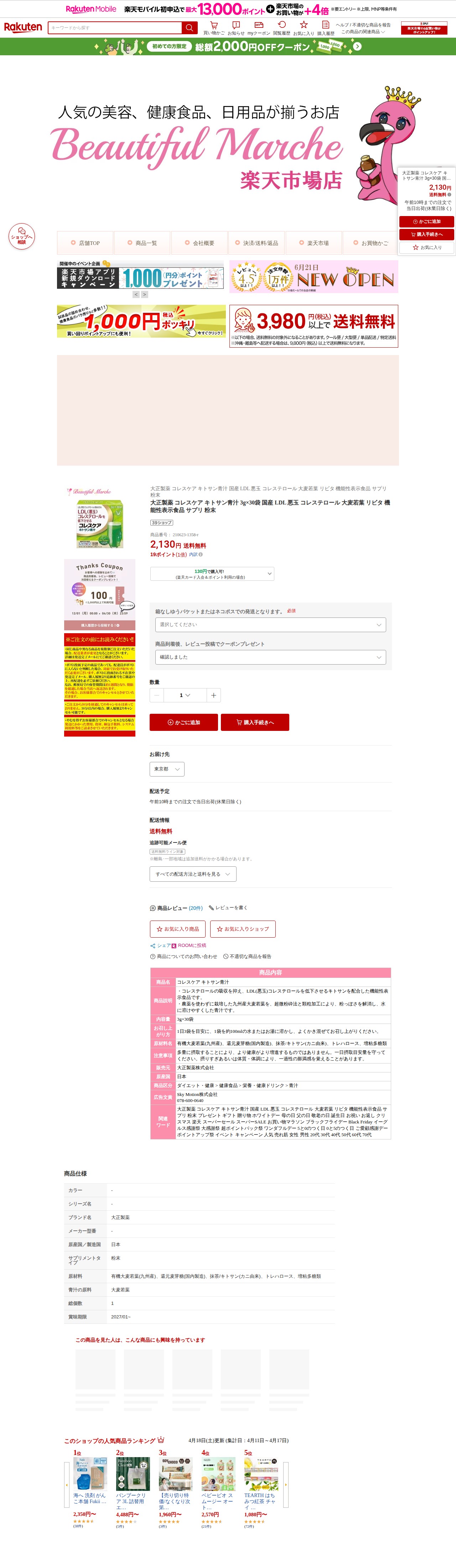 【楽天市場】大正製薬 コレスケア キトサン青汁 3g×30袋 国産 LDL 悪玉 コレステロール 大麦若葉 リビタ 機能性表示食品 サプリ 粉末:Beautiful Marche 楽天市場店 - 保存されたスクリーンショット