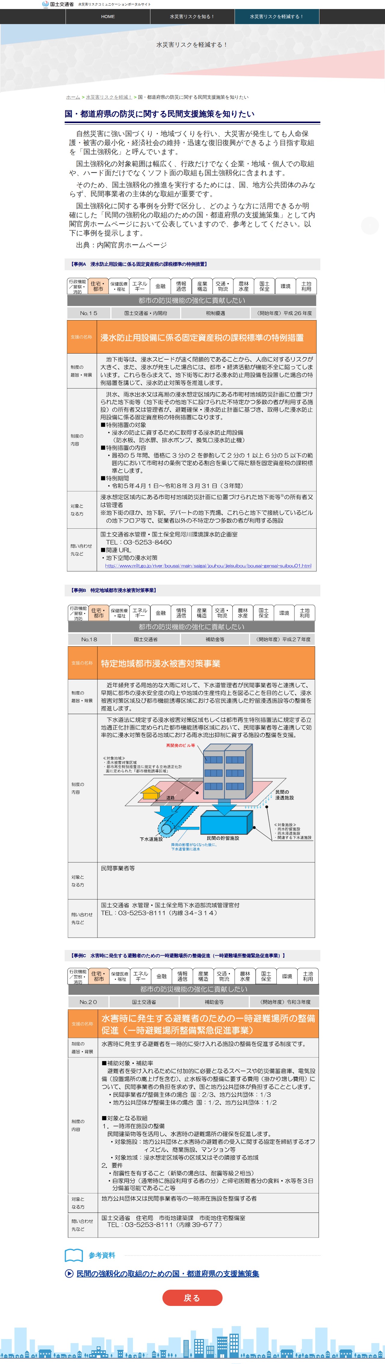 このページは、水災害リスク軽減に関する国・都道府県の民間支援施策を紹介するものです。自然災害に強い国づくりを目指す「国土強靱化」について説明し、行政だけでなく企業・地域・個人による取組の重要性を述べています。国土強靱化はハード・ソフト両面の対策を含み、民間事業者の主体的な参画が不可欠であることを強調しています。具体的な支援施策として、浸水防止設備の固定資産税特例措置、特定地域都市浸水被害対策事業、水害時の一時避難場所整備促進事業などの事例を紹介しています。