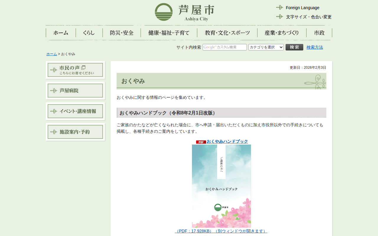 https://www.city.ashiya.lg.jp/kouhou/konnatoki/okuyami.html2026年4月9日 07:09 JST•アーカイブページ・viewer・ダウンロードは、この保存版を基準に表示されます。