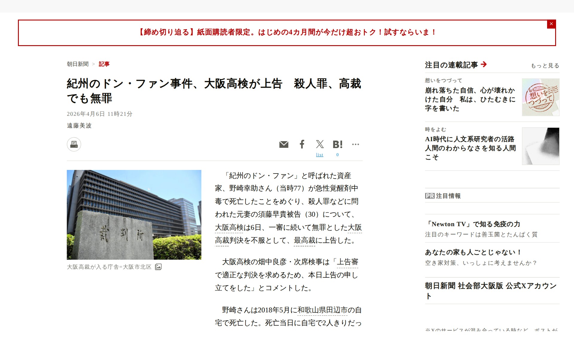 紀州のドン・ファン事件、大阪高検が上告 殺人罪、高裁でも無罪:朝日新聞 - 保存されたスクリーンショット