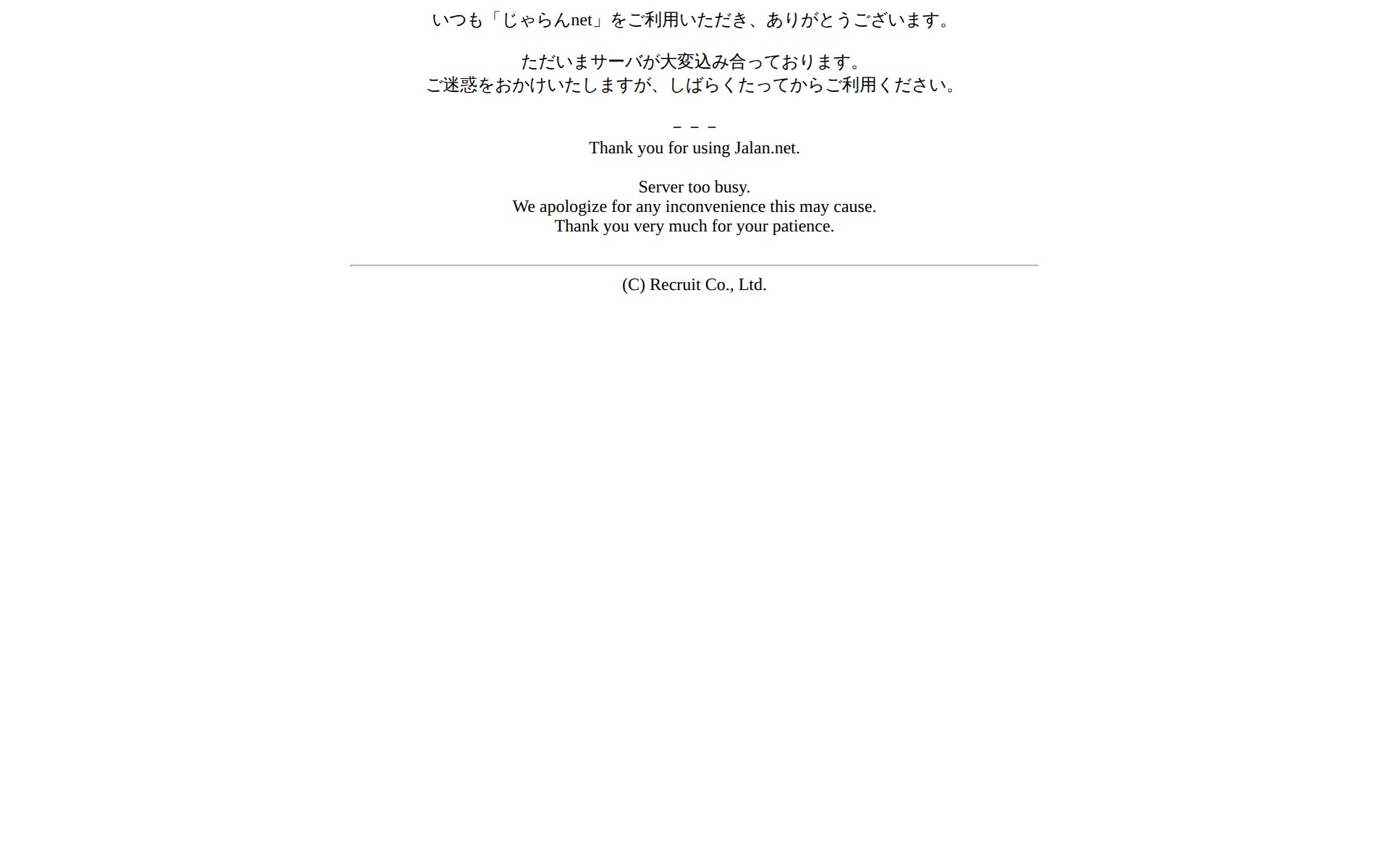 ただいまサーバが大変込み合っております-じゃらんnet いつも「じゃらんnet」をご利用いただき、ありがとうございます。 ただいまサーバが大変込み合っております。 ご迷惑をおかけいたしますが、しばらくたってからご利用ください。 --- Thank you for using Jalan.net. Server too busy. We apologize for any inconvenience this may cause. Thank you very much for your patience. (C) Recruit Co., Ltd.