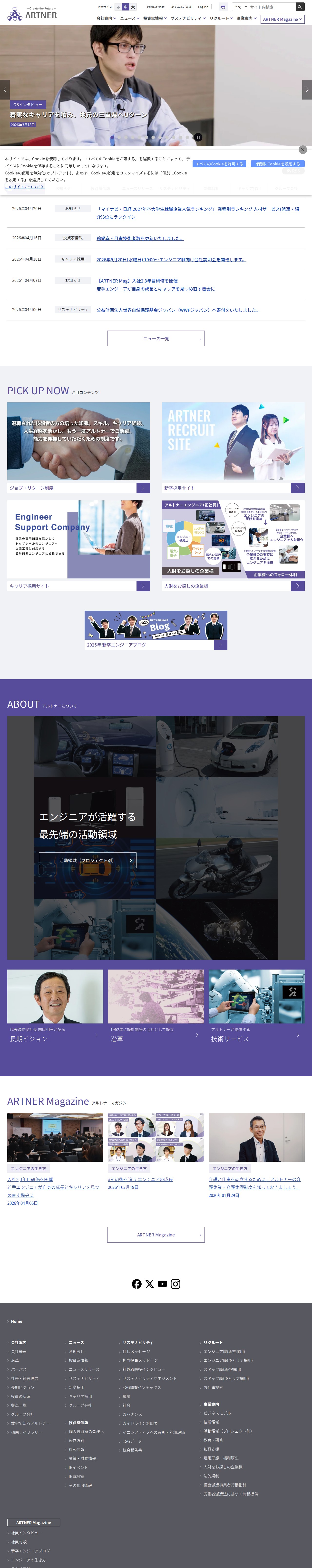 This page is the official website of Artner Co., Ltd., an engineering support company established in 1962. The site provides information on company overview, recruitment (new graduates and career positions), investor relations, and sustainability initiatives. Artner Magazine features articles on engineer careers and work-life balance. Recent news highlights the company's ranking 3rd in the personnel services category of the 2027 graduate employment company popularity ranking. The website offers comprehensive resources including business models, technical domains, training programs, and ESG information for stakeholders.