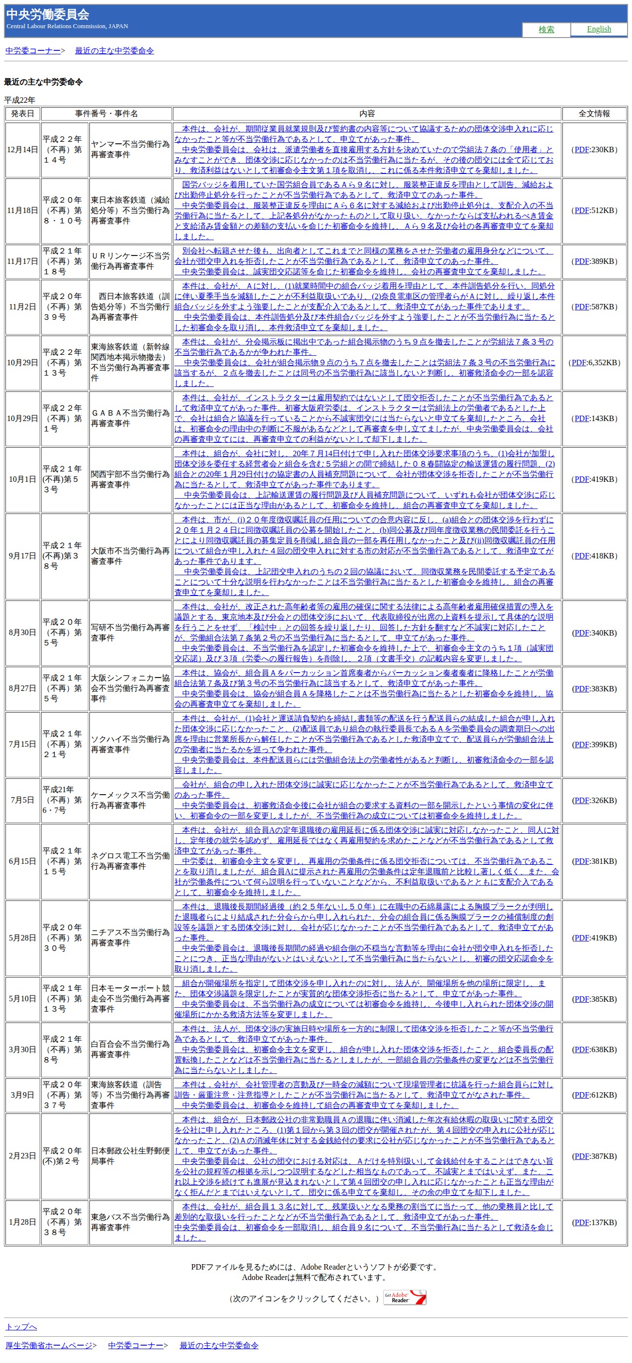 中央労働委員会:最近の主な中労委命令(平成22年)