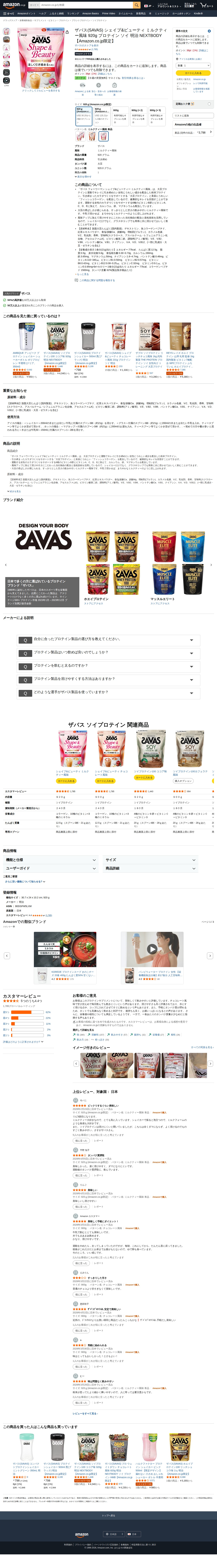 This page displays the Amazon.co.jp product listing for Meiji's SAVAS Shape & Beauty Milk Tea Flavor 920g soy protein supplement. An Amazon.co.jp exclusive product, it has achieved over 7,000 purchases in the past month with an average rating of 4.4 stars from 1,785 reviews. Designed for women seeking body shaping benefits, this multi-supplement formula uses soy as its protein source. It contains allergens including milk and soy. Multiple size options are available for purchase, with delivery handled by Amazon ensuring safety and security.