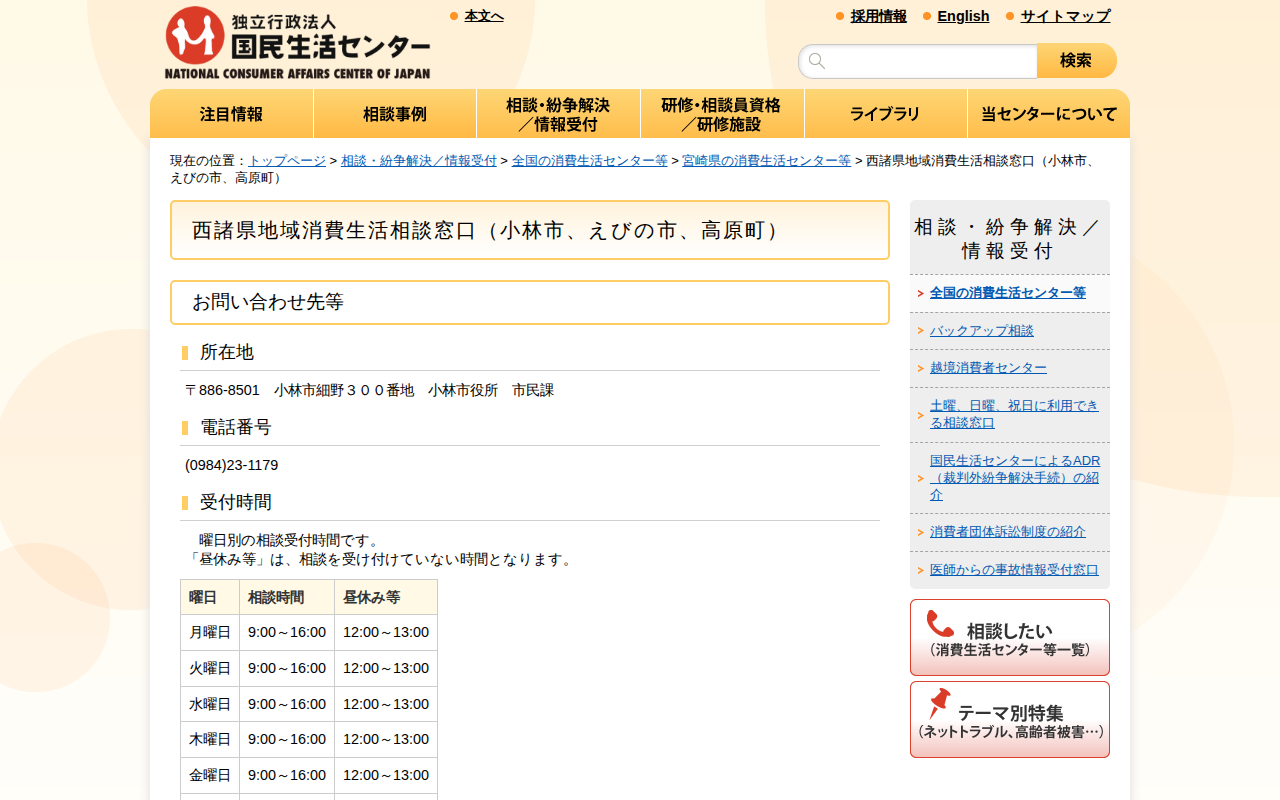 西諸県地域消費生活相談窓口(小林市、えびの市、高原町)(全国の消費生活センター等)_国民生活センター