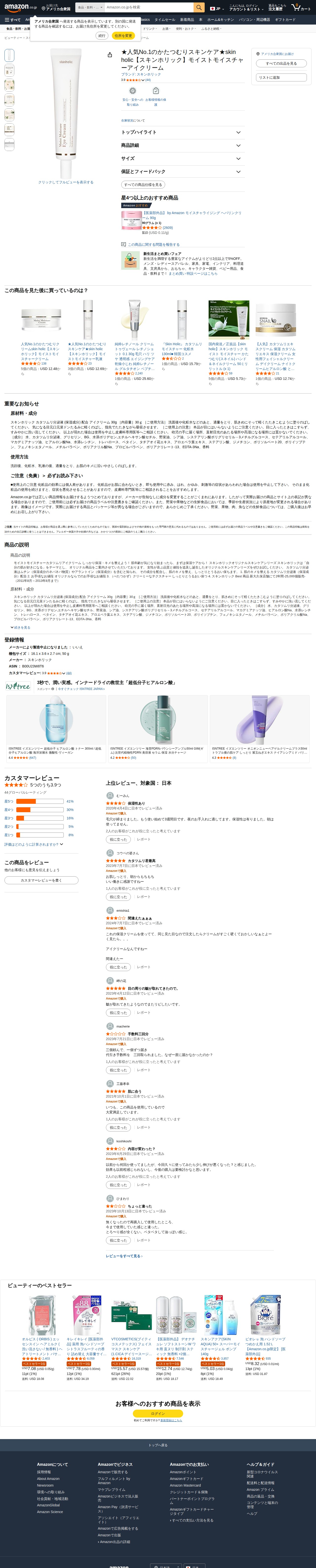 This page displays the Amazon.co.jp product listing for Skin Holic's Moist Moisture Eye Cream, a popular No.1 snail skincare product rated 3.9 out of 5 stars with 44 customer reviews. The product is categorized under Beauty in the moisturizing cream section. Related products from the same brand, including Moist Moisture Cream and toner, as well as other moisturizing skincare items, are also featured on the page.