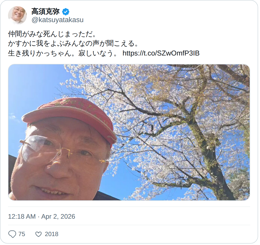 高須克弥@katsuyatakasuPosted: April 2, 2026 at 09:18 AM JSTID: 2039497554786992380