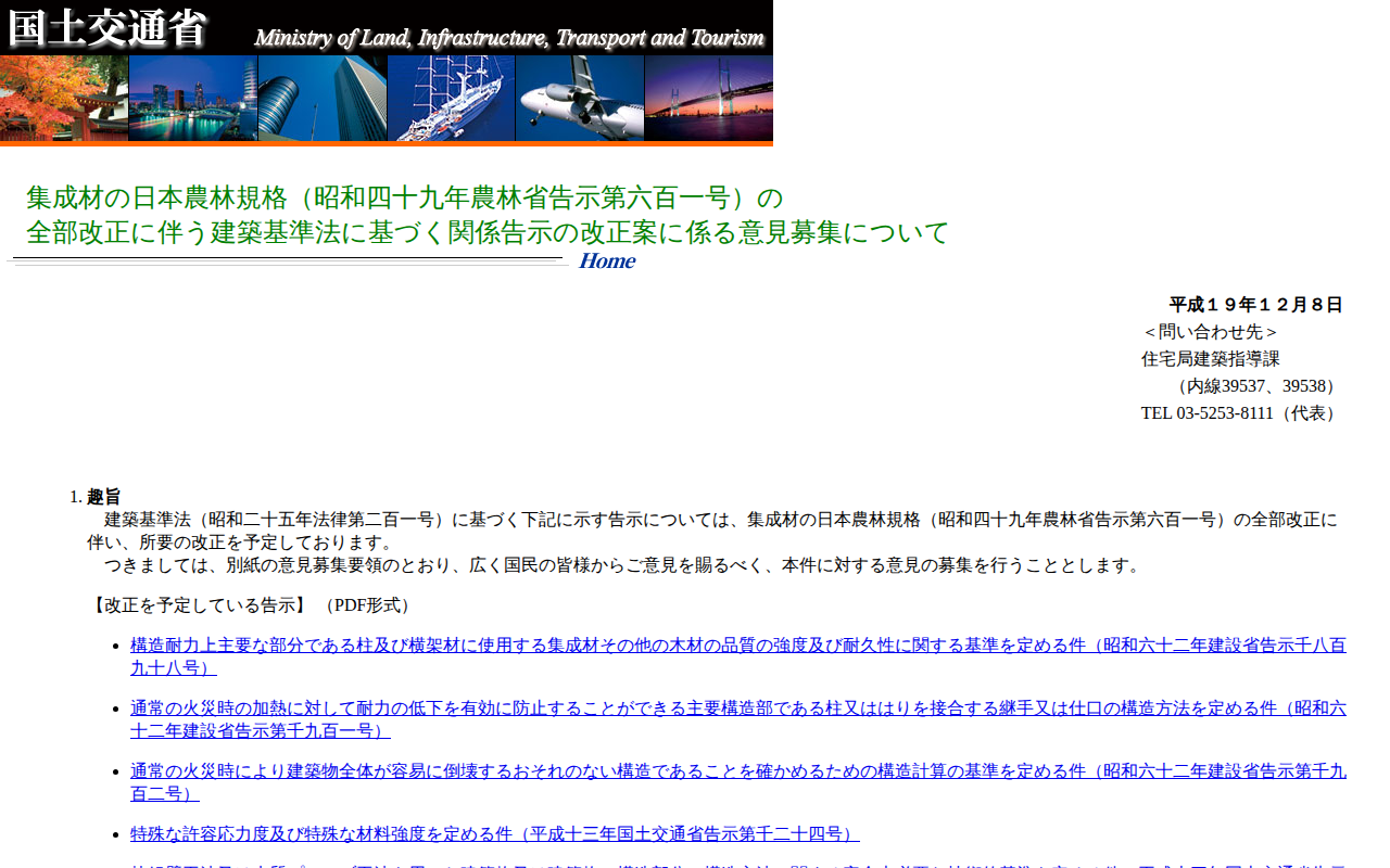 集成材の日本農林規格(昭和四十九年農林省告示第六百一号)の全部改正に伴う建築基準法に基づく関係告示の改正案に係る意見募集について - Saved screenshot