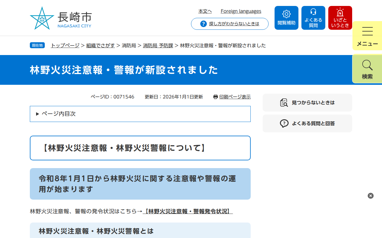 林野火災注意報・警報が新設されました - 長崎市ウェブサイト(消防局 予防課) - Saved screenshot