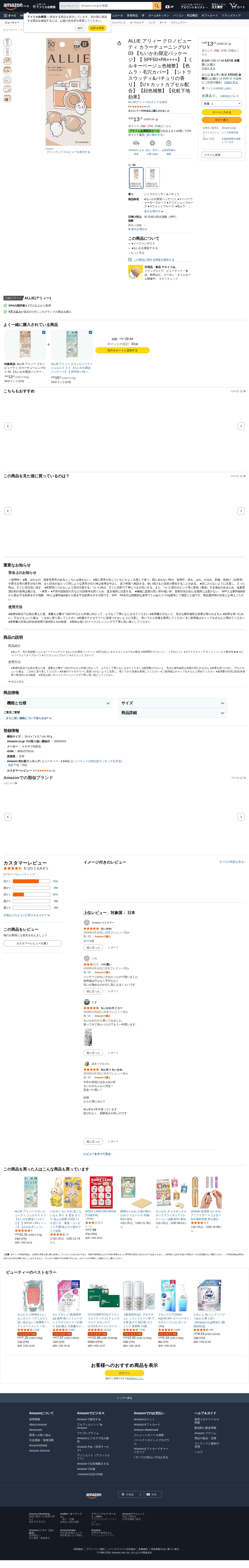Amazon.co.jp: ALLIE アリィー クロノビューティ カラーチューニングUV 03 【ちいかわ限定パッケージ】【 SPF50+PA++++】【 ミルキーベージュ色補整】【色ムラ・毛穴カバー】 【シトラスウッディ&パチュリの香り】【UVカットカプセル配合】 【顔色補整】【化粧下地効果】 : ビューティー