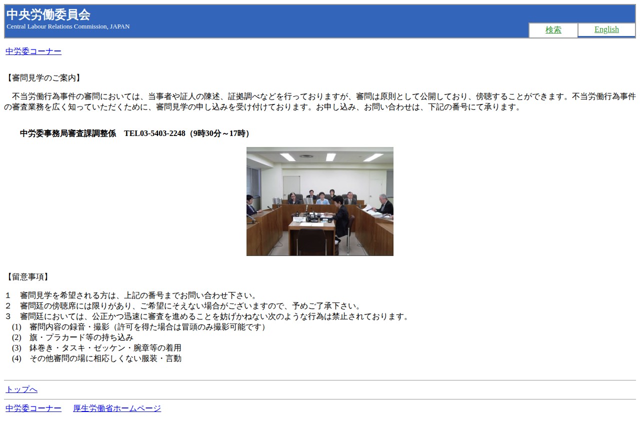 This page provides information about observing hearings at Japan's Central Labour Relations Commission under the Ministry of Health, Labour and Welfare. Unfair labor practice case hearings are open to the public, allowing observers to watch testimony from parties and witnesses, as well as evidence examination. Applications for hearing observation are accepted by the Commission's Planning and Coordination Division (TEL: 03-5403-2248). Seating is limited. Prohibited activities include recording and photography, bringing flags or placards, wearing headbands or sashes, and inappropriate clothing or conduct that may interfere with fair and efficient proceedings.