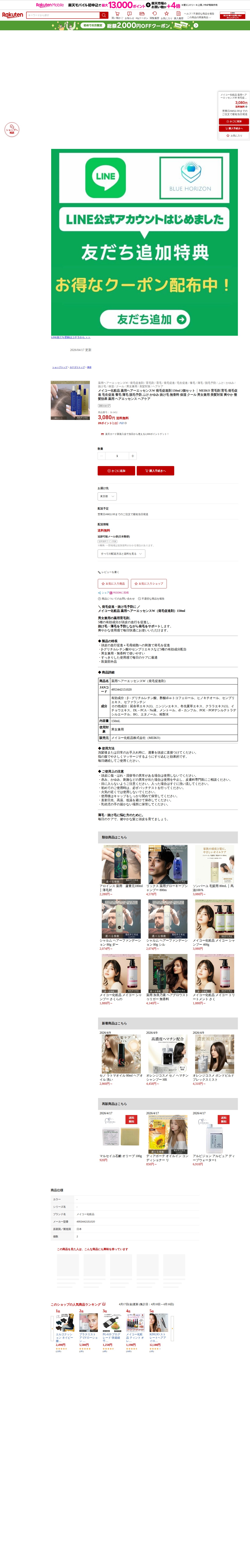 This page presents Meiko Cosmetics Medicinal Hair Essence W, a hair growth promoting agent sold on Rakuten Market. Priced at 3,080 yen with free shipping, it contains five active ingredients including β-glycyrrhetinic acid to stimulate scalp blood circulation and promote hair growth. The unscented, gender-neutral product is a quasi-drug classified item. Users apply it directly to the scalp after shampooing and massage gently. Designed to prevent hair loss and thinning through daily care.