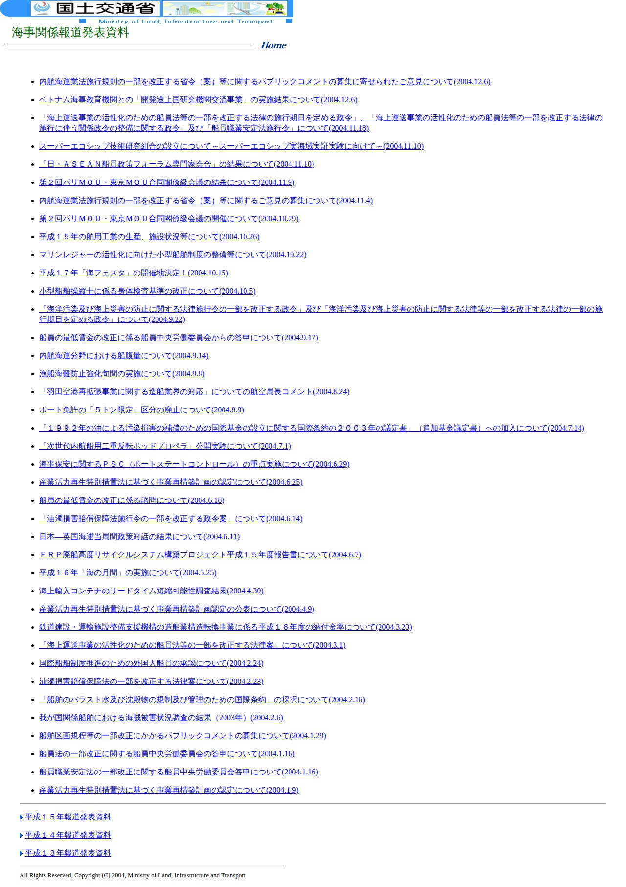 This page contains maritime-related press releases issued by Japan's Ministry of Land, Infrastructure and Transport in 2004. It covers topics including amendments to domestic shipping laws, seamen law reforms, ship safety regulations, maritime pollution prevention, international treaty accessions, small vessel licensing reforms, crew welfare issues, and technological initiatives like the Super Eco Ship project. The page provides information on policy decisions, consultation results, and implementation details regarding maritime transport, shipbuilding, and seafarer employment.