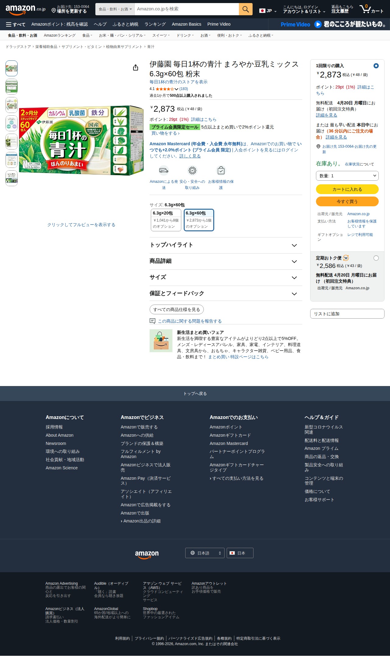 Amazon.co.jp: 伊藤園 毎日1杯の青汁 まろやか豆乳ミックス 6.3g×60包 粉末 : 食品・飲料・お酒 - Saved screenshot