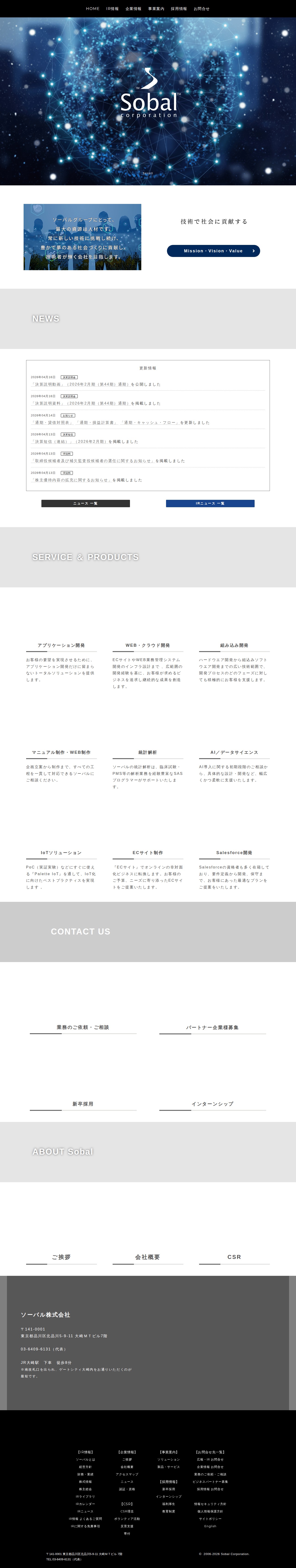 This page is the official website of Sobal Corporation, a company committed to contributing to society through technology. The company offers diverse services including application development, web and cloud development, embedded development, manual creation, statistical analysis, AI/data science, IoT solutions, e-commerce site creation, and Salesforce development. Headquartered in Shinagawa, Tokyo, the site provides links to IR information, recruitment, and contact pages, showcasing its comprehensive technological solutions for various business needs.