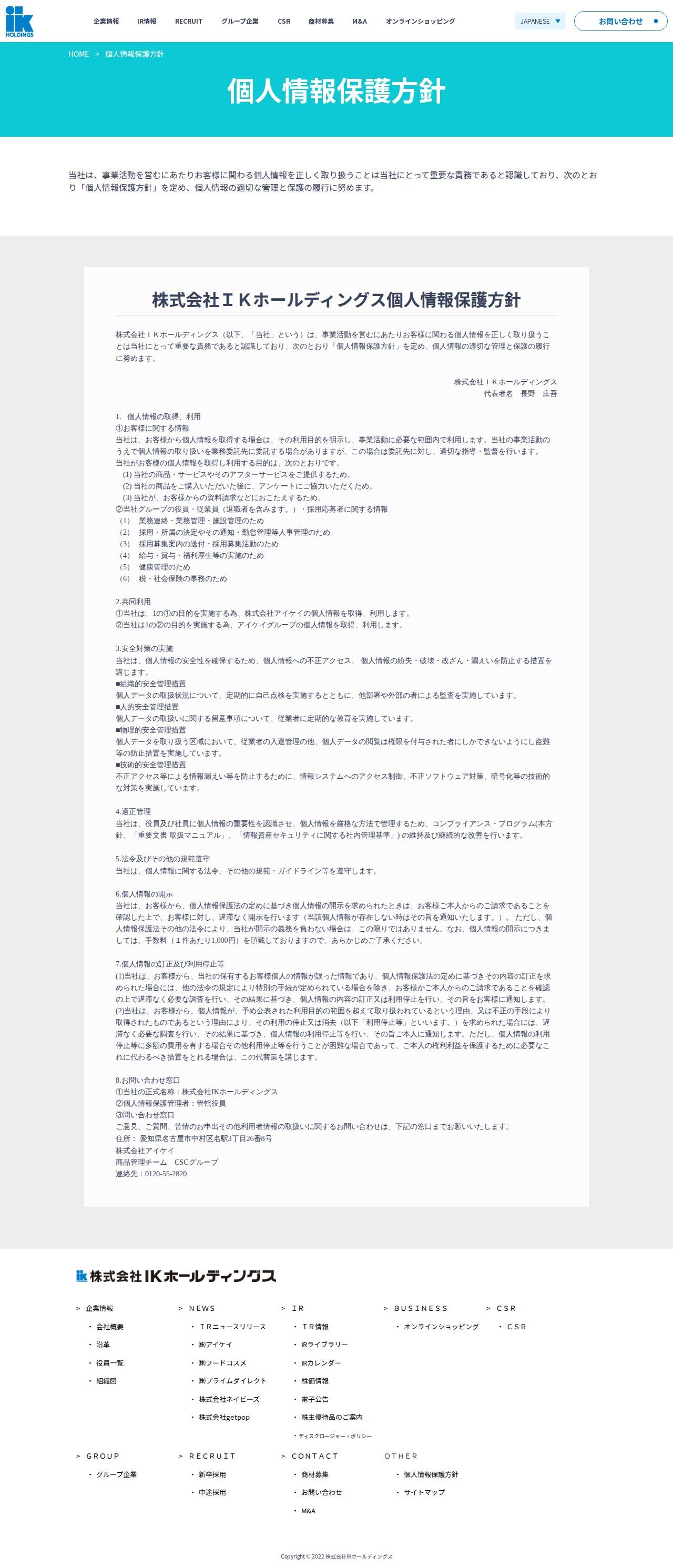 This page outlines IK Holdings' Personal Information Protection Policy. The company recognizes that properly handling customers' personal information is an important responsibility. Personal information is collected and used for purposes such as providing products/services, offering after-sales service, and requesting survey cooperation. The company implements organizational, human, physical, and technical safety measures to prevent unauthorized access, loss, destruction, alteration, and leakage of personal data. Regular self-inspections and employee training are conducted. The company complies with relevant laws and maintains continuous improvement of compliance programs. Customer requests for disclosure, correction, and cessation of use are handled appropriately.