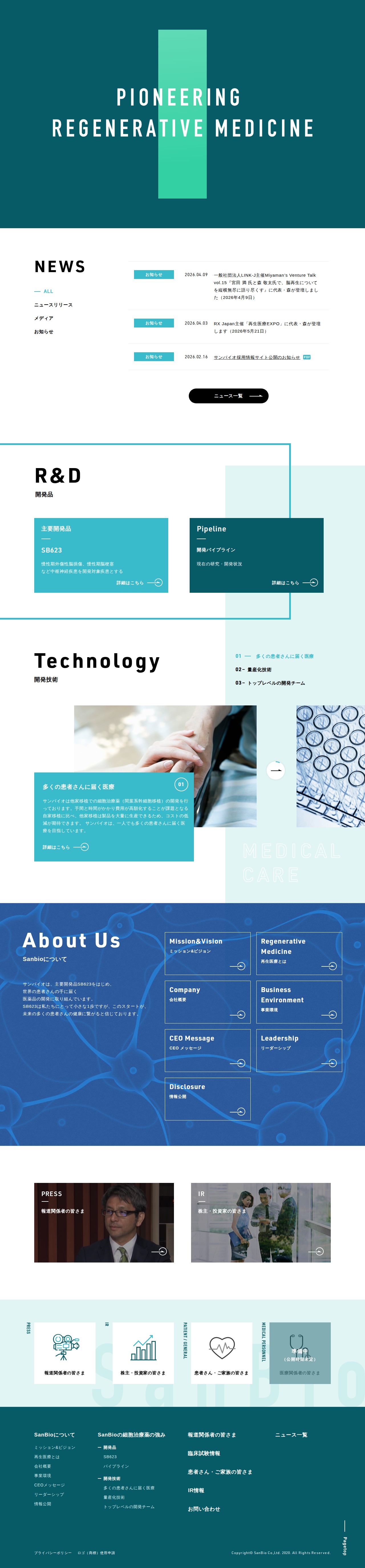 This page is the official website of SanBio, a regenerative medicine and cell therapy company. The main development product SB623 targets central nervous system diseases, including chronic traumatic brain injury and stroke. SanBio focuses on allogeneic cell transplant therapy using mesenchymal stem cells, which enables cost reduction and mass production compared to autologous transplants, aiming to deliver medical solutions to more patients worldwide. The site provides recruitment information, IR data, and clinical trial information for various stakeholders.